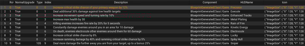 ▧ Faster Iterations: Upgrades key info was easily changed in a general data table, whereas upgrade specific info was changed in the component logic itself, allowing me to quickly test different possibilities.